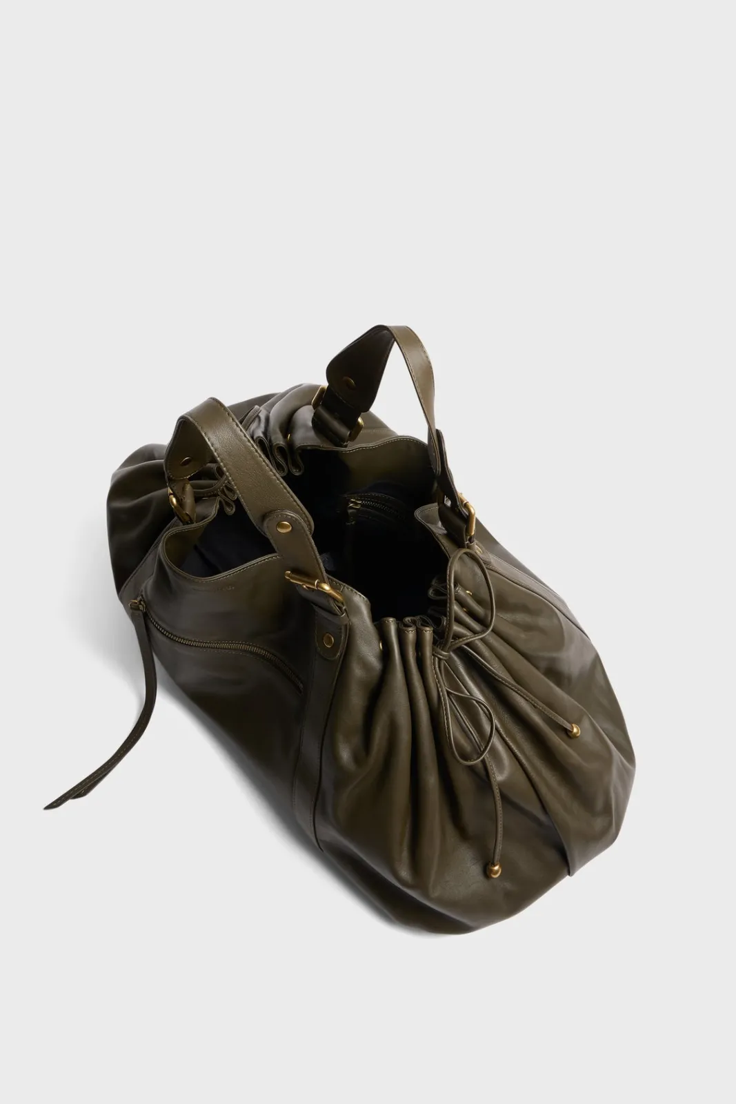 - – Bag gathered on the sides by two leather links, wrapped in body bands