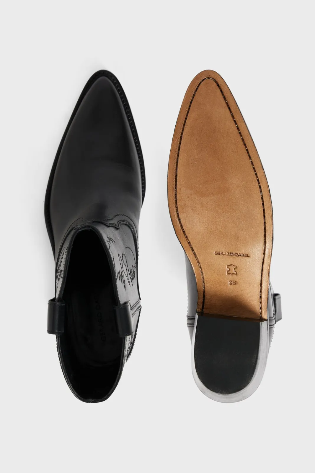 Pointed-toe heeled boots with a western-inspired design. Embroidered patterns on the sides and decorative stitching. 100% cowhide leather.