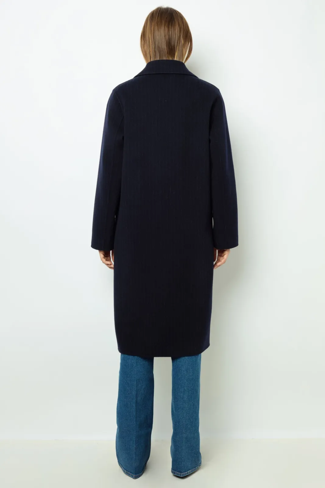 Straight cut coats with fine stripes. Double-face wool blend, as soft on the inside as on the outside.