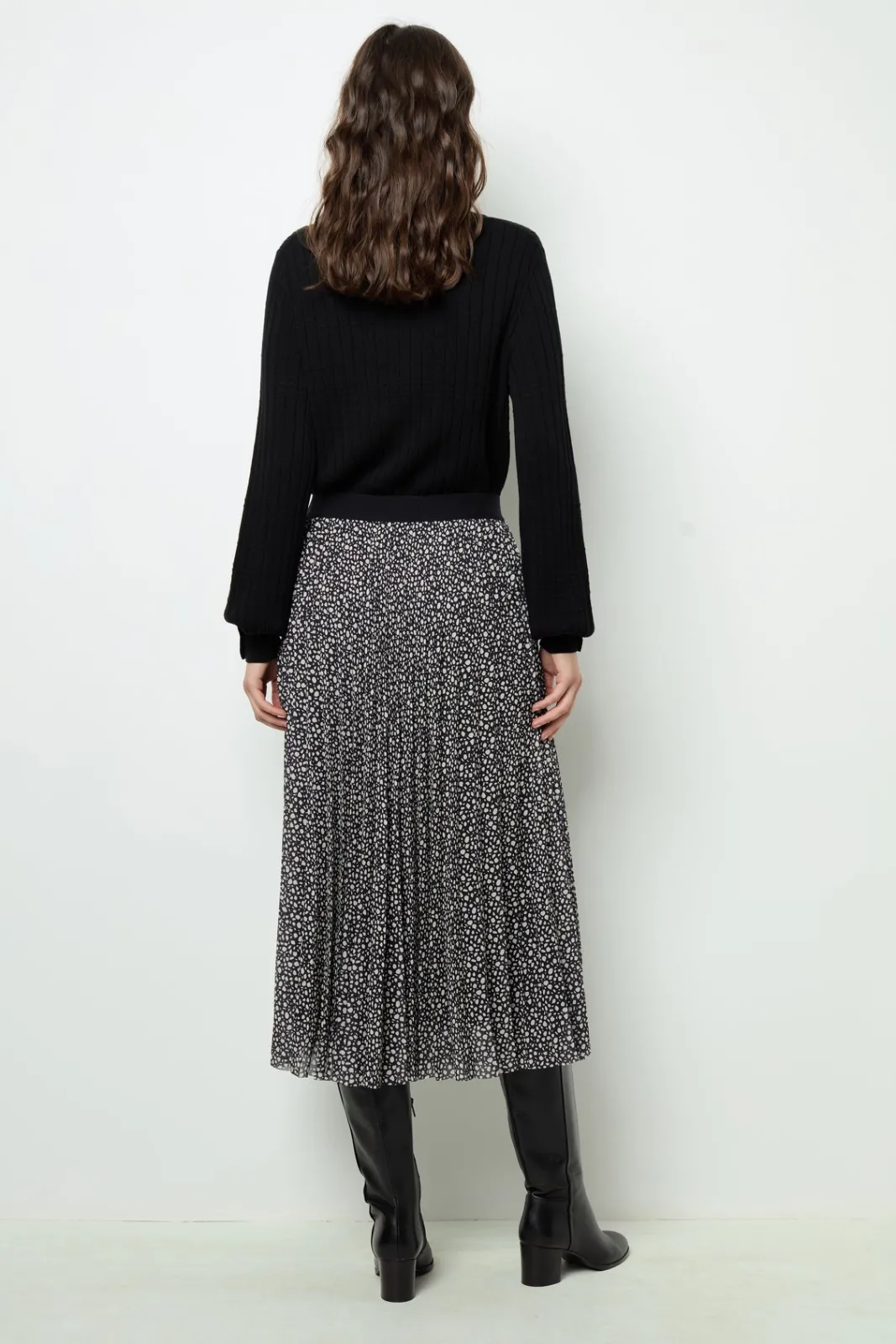 Pleated skirt with contrasting polka-dot style print.-Pleated-Graphic pattern-Midi-Elasticated waist-The model is 177cm …